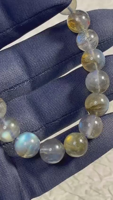 Ce bracelet en Labradorite fascine par ses éclats bleutés, verts et dorés. Pierre des thérapeutes, elle protège tout en stimulant l'intuition et la créativité.