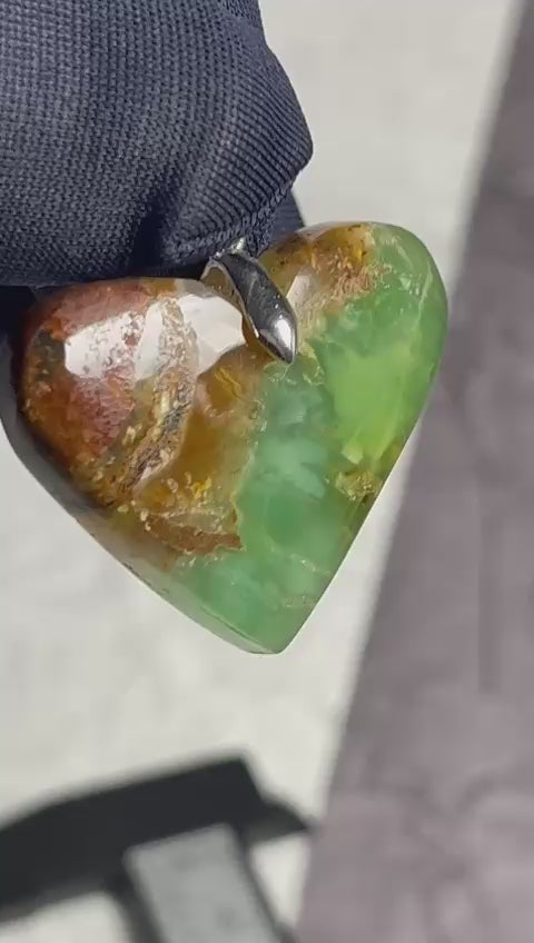 Ce pendentif unique associe la douceur verte de la Chrysoprase à la profondeur terrestre de l’Opale Boulder. Une alliance rare et naturelle, pleine de vitalité et de profondeur.