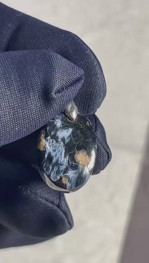 Ce pendentif en Pietersite de haute qualité présente des tourbillons chatoyants de bleu, d’or et de brun. Chaque pièce évoque un ciel en mouvement, entre orage et lumière, offrant un bijou au caractère puissant et mystique.